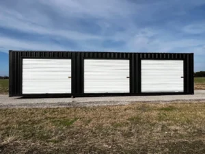 The modified 40ft High Cube Shipping Container with 3 Roll-Up Side Doors and custom black paint is a versatile and spacious storage solution suitable for various industrial and business applications. Fabricated in the United States, this modified shipping container features three 10×7 roll-up doors for easy access to your items. The high cube design provides additional storage space, making it ideal for storing a wide range of materials and supplies. With its durable construction and convenient roll-up doors, this container offers a reliable and efficient way to store your goods.